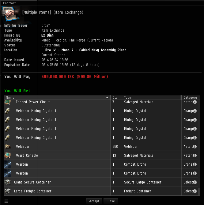 The scammer sets up a contract that appears to contain the modules and support items (e.g. Mining Crystals, Drones etc..) for an Orca in a mining support role. The contract is priced very competitively when you take into account the price of the ship, modules and any extra items.